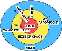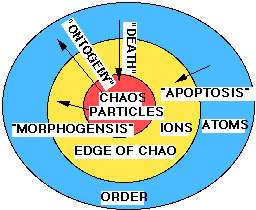 We aim to illustrate that this characterization of these three regimes appears to be the underlying process structure of the increasing complexity of existence. Abstractly, each level of complexity has three basic regions as depicted in Figure 2a: the chaotic region, the order region, and the edge between the chaotic and order region. Figure 2b depicts the major level of complexity 2 in terms of these three regions. The chaotic region of a level of complexity supplies the evolutionary energy for the growth of an "edge of chaos" for the next level of complexity. The order region is the "material" area for storage of dynamic structures that were created by the process at the edge of chaos. The order region largely preserves the information at a level of complexity in these dynamic structures. But in addition, these structures in the order region can be fedback into the edge of chaos by energy fluctuations created by the turbulence of the chaotic region into the dynamic structures of the order region.
