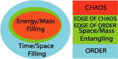 We aim to illustrate that this characterization of these three regimes appears to be the underlying process structure of the increasing material complexity of existence. Abstractly, each level of complexity has three basic regions as depicted in Figure 2a: the chaotic region, the order region, and the edge between the chaotic and order region. Figure 2b depicts the major level of complexity 2 in terms of these three regions. The chaotic region of a level of complexity supplies the evolutionary energy for the growth of an "edge of chaos" for the next level of complexity. The order region is the "material" area for storage of dynamic structures that were created by the process at the edge of chaos. The order region largely preserves the information at a level of complexity in these dynamic structures. But in addition, these structures in the order region can be fedback into the edge of chaos by energy fluctuations created by the turbulence of the chaotic region into the dynamic structures of the order region. Another simple metaphor to visualize the level of complexity, is view each level centered on a conceptual form of equilibrium in time and space, even though there is no such thing as an equilibrium in reality. The massive equilibrium, which is not exactly in equilibrium replicates and dissipates from that time and space center.