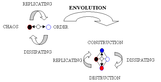 Syntactically there is very little difference between the two metaphors, entropy and evolution – they are simple models, to a degree mirror images of each other. So a more complete metaphor would be to combine the two models of Clausius and Darwin to form a replicative/dissipative structure.