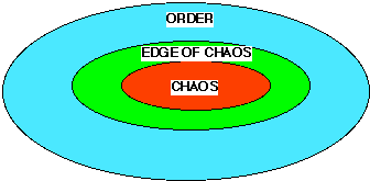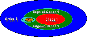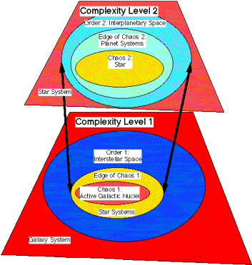 Abstractly, each level of complexity has three basic regions as depicted in Figures 7 and 8: the chaotic region, the order region, and the edge between the chaotic and order region. Figures 7 and 8 depict the major levels of material complexity 1& 2 in terms of these three regions. The chaotic region of a level of complexity supplies the evolutionary energy for the growth of an "edge of chaos" for the next level of complexity. The order region is the "material" area for storage of dynamic structures that were created by the process at the edge of chaos. The order region largely preserves the information at a level of complexity in these dynamic structures. But in addition, these structures in the order region can be fed back into the edge of chaos by energy fluctuations created by the turbulence of the chaotic region into the dynamic structures of the order region.